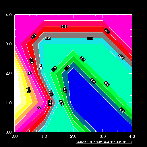 The third frame of the example draws the same contour plot and uses the resource that is set in the resource file. However, in this example, a resource is set explicitly when the object is created. The resource, cnLineLabelsOn, controls whether or not the contour line labels are visible. In this case, the resource is set to "False" so the labels will not appear.