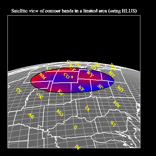 This example shows how to do a combination of things: restrict a contour plot to a certain area over a satellite projection, how to label the US states with AnnoManager, how to use NhlDataPoly{line,marker} to draw lines/markers on a map projection, and how to mix LLUs/HLUs to draw text in the map projection. The NCL version doesn't have the LLU/HLU part. The names of the example codes that create this plot are cn17c.c, cn17f.f, and cn17n.ncl.