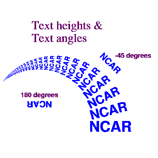 This example can be created using HLU C library calls, HLU FORTRAN library calls, or NCL. This example demonstrates how to set the angle and height of a text string. The names of the source files for this example are tx05c.c, tx05f.f, and tx05n.ncl.
