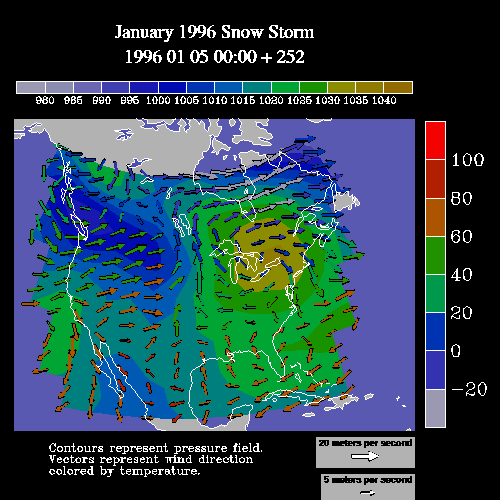 The data for this plot is from several netCDF files called Ustorm.cdf, Vstorm.cdf, Pstorm.cdf, and Tstorm.cdf.The data files are located in your NCAR Graphics data directory in a subdirectory called "cdf". You can get the name of the data directory by typing "ncargpath data" at your shell prompt. If you have netCDF installed on your system, then you can change directory to where the netCDF files reside and type "ncdump -h file.cdf" to view the header information for this data file.