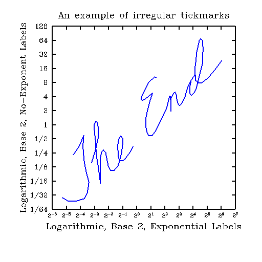 This example can be created using HLU C library calls, HLU FORTRAN library calls, or NCL. This example demonstrates how to create a plot that uses irregular points to change the plot transformation. This example also shows how to read data from an ASCII file using the asciiread function (NCL only). The names of the source files for this example are xy08c.c, xy08f.f, and xy08n.ncl.