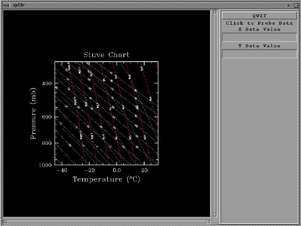 This example is created using HLU C library calls. It demonstrates how to interactively retrieve coordinate values from a plot using a point-and-click interface. The name of the source file for this example is xy13c.c.