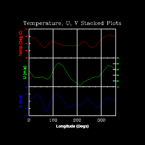 This example reads an ASCII file with 4 variables: lon, u, v, and t. The variables u, v, and t are stacked, each sharing the same X axis, and having their own Y axis.
